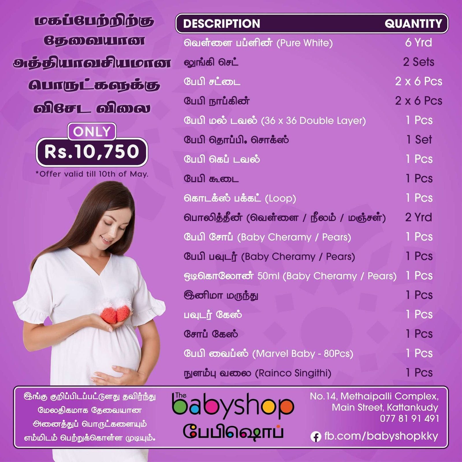 பொருட்களுக்கு விலை அதிகரித்துச் செல்லும் இக்கால கட்டத்தில் மகப்பேற்றிற்கு தேவையான தரமான அத்தியவசிய பொருட்களுக்கு தற்போது the BabyShop Kattankudy ல் Rs.10750/= மாத்திரமே