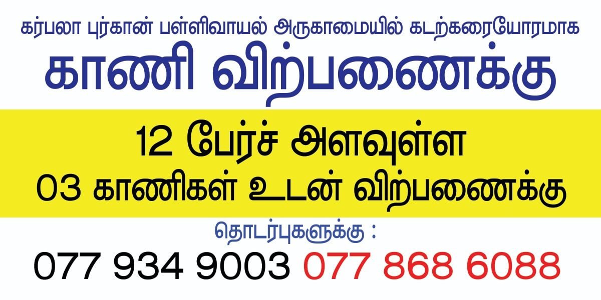 காத்தான்குடி பாலமுனை பிரதான வீதியில் கர்பலா பகுதியில் கடற்கரையோரமாக 56X66அடி அளவுடைய இரண்டு வீடுகள் கட்டகூடிய 03 காணிகள் உடனடியாக விற்பனைக்கு உண்டு