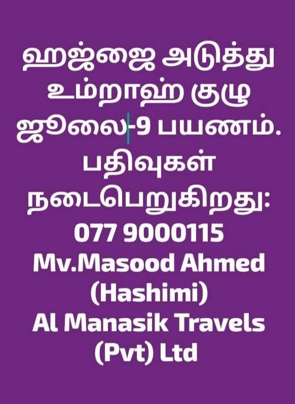 ஹஜ்ஜை அடுத்து எமது உம்றாஹ் குழு இன்ஷா அல்லாஹ் எதிர்வரும் : ஜூலை 9/07/2025 பயணிக்க தயாராகவுள்ளது.