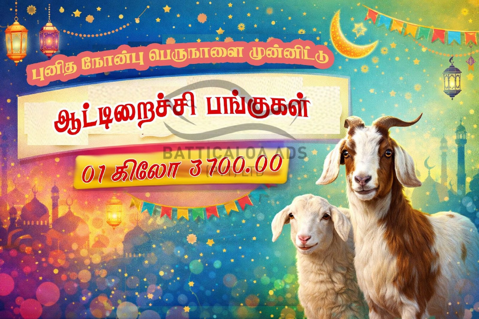 எதிர்வரும் நோன்புப் பெருநாளை முன்னிட்டு எங்களிடம் ஆட்டு இறைச்சி பங்குகளை பெற்றுக்கொள்ளளாம்.