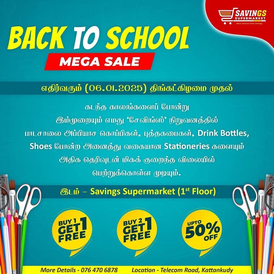 📑 கடந்த காலங்களைப் போன்று இம்முறையும் எமது ‘சேவிங்ஸ்’ நிறுவனத்தில் School Books, School Bags, Drink Bottles, Shoes போன்ற அனைத்து வகையான Stationery’s களையும் அதிக தெரிவுடன் மிகக் குறைந்த விலையில் பெற்றுக்கொள்ள முடியும். 😍