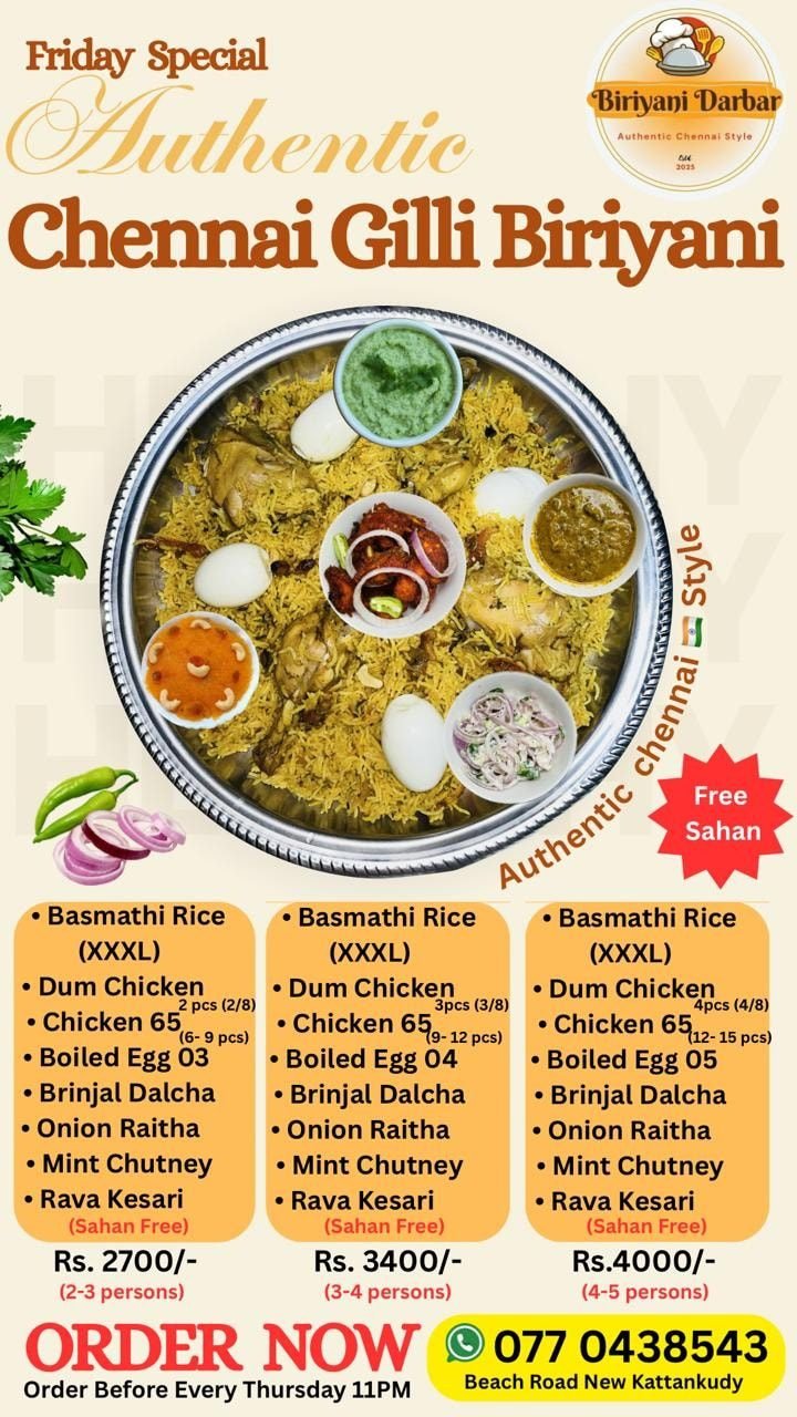 தரமான மற்றும் சுவையான சென்னை style பிரியாணி சகன்களை எம்மிடம் பெற்றுக்கொள்ளலாம்