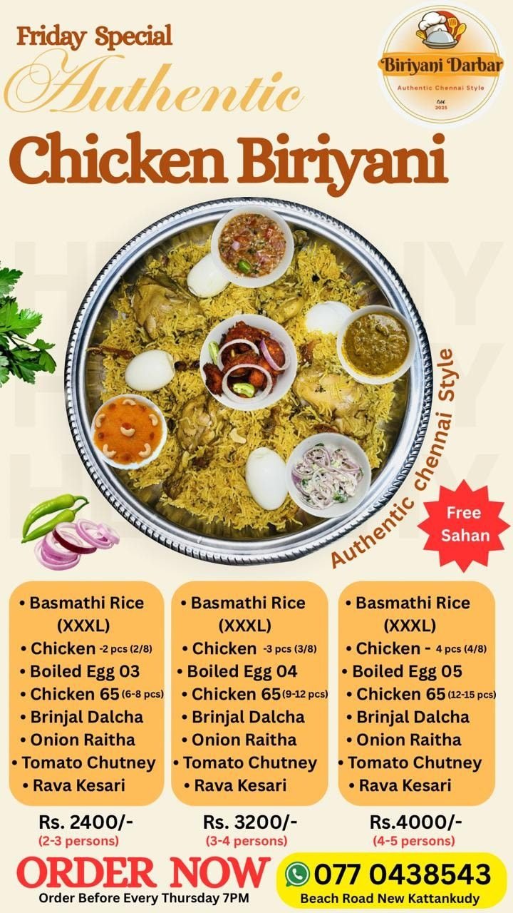 தரமான மற்றும் சுவையான சென்னை style பிரியாணி சகன்களை எம்மிடம் பெற்றுக்கொள்ளலாம்