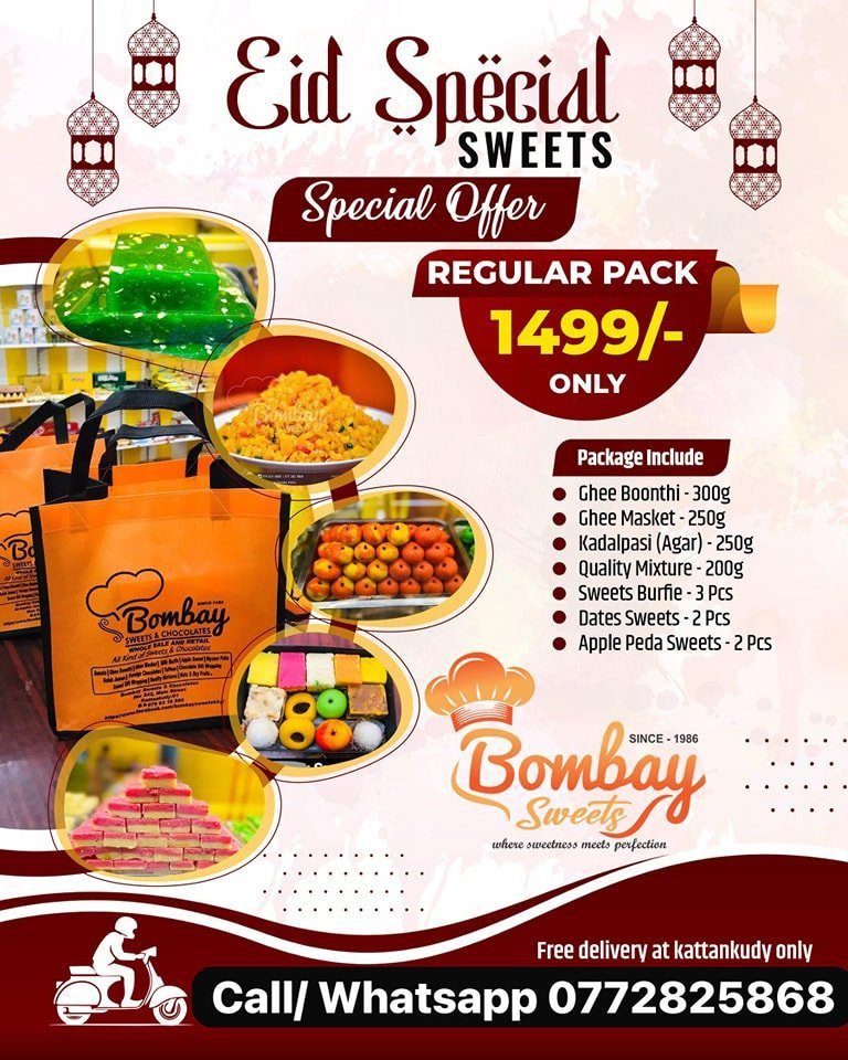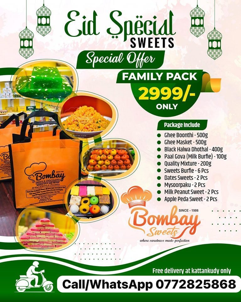எதிர்வரும் நோன்பு பெருநாள் மற்றும் சித்திரைப் புது வருடத்தை முன்னிட்டு Bombay Sweets & Chocolates வழங்கும் விஷேட சலுகை ஆச்சரியமான விலைக்கழிவுடன் Eid Sweets Pack .