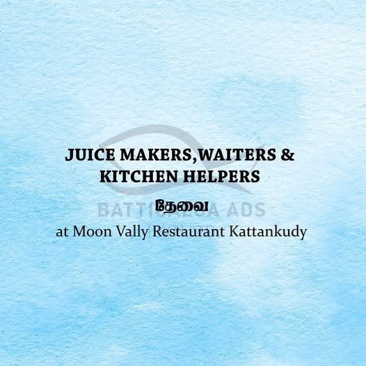 காத்தான்குடியில் இயங்கும் பிரபலமான Moon Valley Restaurant ற்கு அனுபவமுள்ள Juice Maker, Waiters மற்றும் Kitchen Helper தேவை