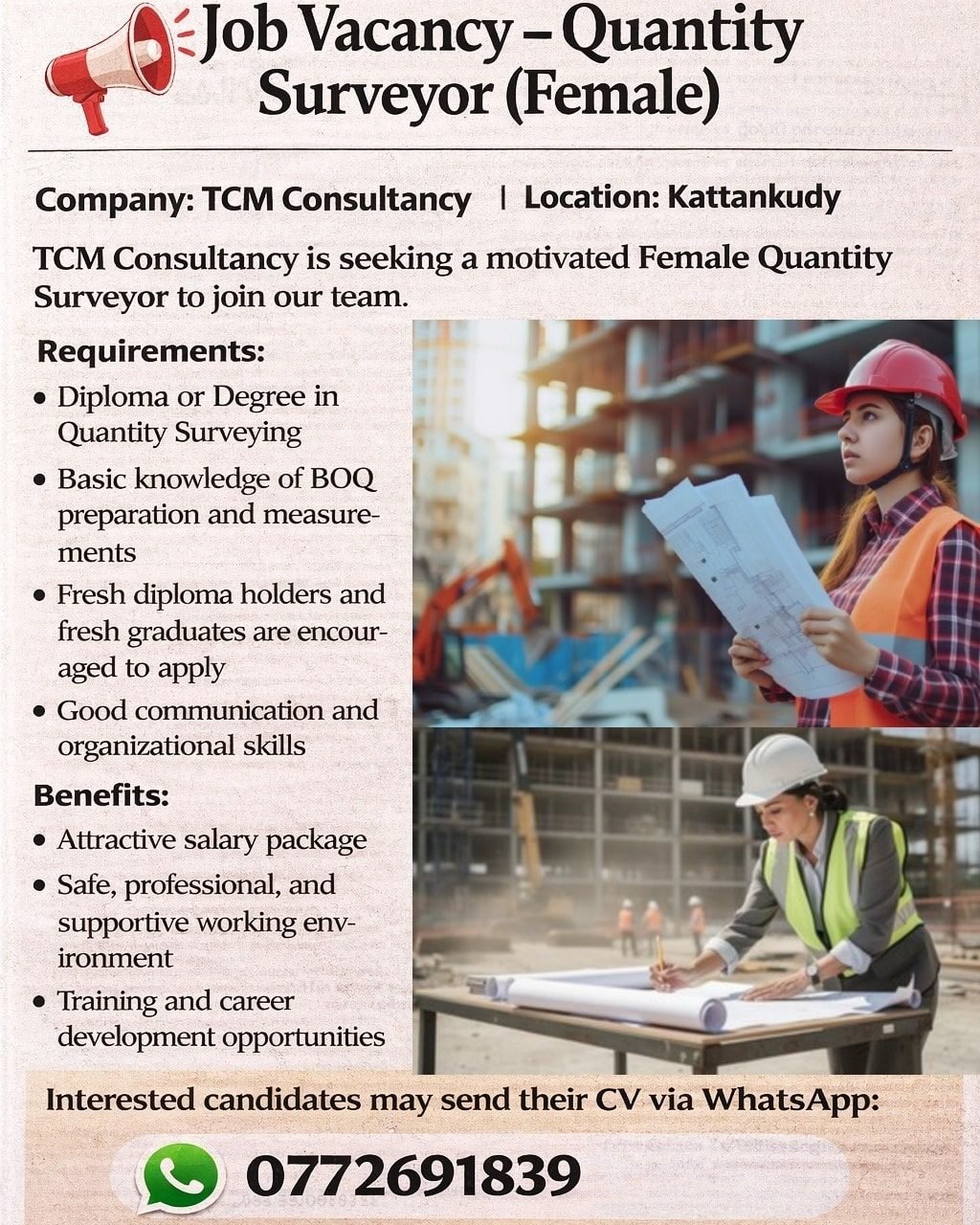 We are Hiring Quantity Surveyor (Female) at TCM Consultancy Kattankudy