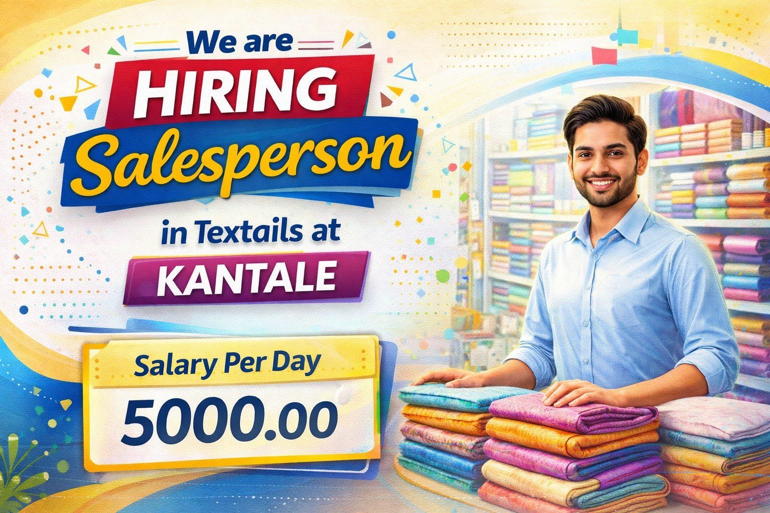 புடவைக் கடைக்கு நன்கு தொழில் அனுபவமுள்ள சிங்களம் சரளமாக பேசத்தெரிந்த Sales Man தேவை