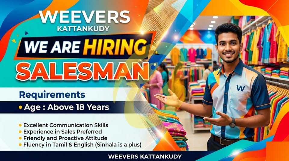 காத்தான்குடி பிரதான வீதியில் இயங்கும் WEEVERS ஆடைகள் காட்சியறைக்கு 18 வயதுக்கு மேற்பட்ட (திருமனமாகாத) விற்பனையாளர் (Salesperson) தேவை