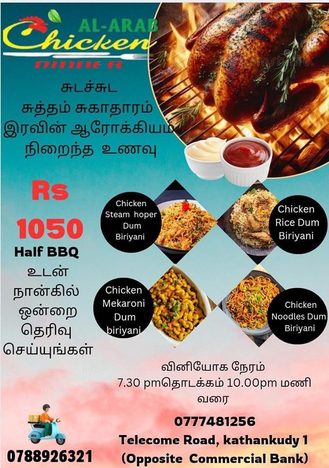 பிரியானி ஓடர்கள் தினந்தோறும் காலை 8.00am தொடக்கம் 12.00pm மணி வரை தரப்படும் தொலைபேசி ஓடர்கள் ஏற்றுகொள்ளப்படும்.