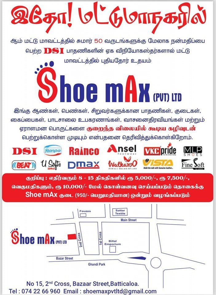 மட்டக்களப்பு மாவட்டத்தில் 50 வருடங்களுக்கு நன்மதிப்பை பெற்ற DSI பாதணிகளின் ஏக விநியோகஸ்தர்களாக விளங்கும் Shoe Max (PVT) LTD ஸ்தாபனம்