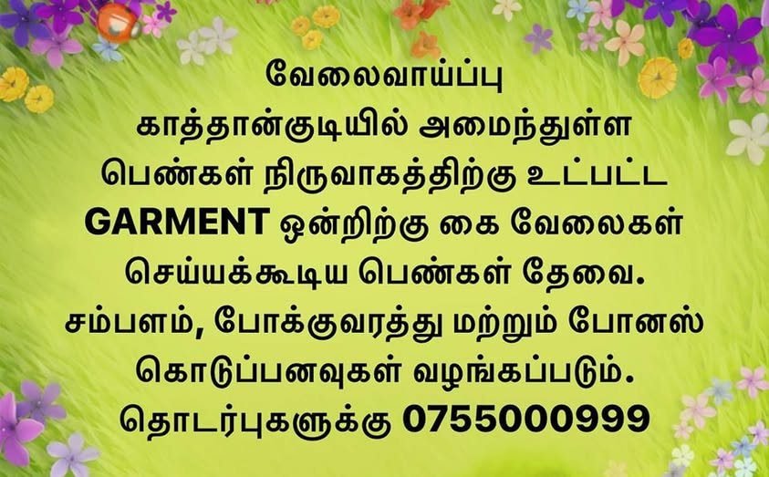 காத்தான்குடியில் அமைந்துள்ள பெண்களின் முகாமைத்துவத்தில் இயங்கும் Garment ஒன்றிற்கு கை வேலைகள் செய்யக்கூடிய பெண்கள் தேவை