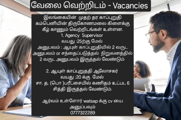 இலங்கையின் முதற்தர காப்புறுதி கம்பெனியின் திருகோணமலை கிளைக்கு கீழ் காணும் வெற்றிடங்கள் உள்ளன.