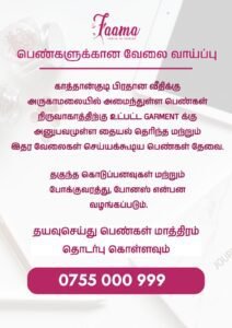 தையல் தெரிந்த பெண்கள் தேவை – Faama Garment Kattankudy